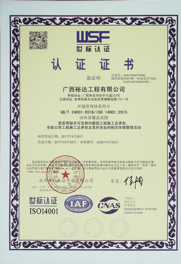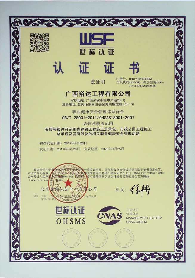 2017年9月7日至16日,經(jīng)過(guò)專(zhuān)家組兩輪現(xiàn)場(chǎng)審核,廣西裕達(dá)工程有限公司順利通過(guò)了GB/T19001-2016《質(zhì)量管理體系》、GB/T24001-2016《環(huán)境管理體系》、GB/T28001—2011《職業(yè)健康安全管理體系》、GB/T50430-2007《工程建設(shè)施工企業(yè)質(zhì)量管理規(guī)范》三標(biāo)一體的認(rèn)證,并于2017年9月26日獲得由北京世標(biāo)認(rèn)證中心有限公司頒發(fā)的ISO9001:2015、GB/T50430-2007、ISO14001:2015和GB/T 28001-2011的認(rèn)證證書(shū)。