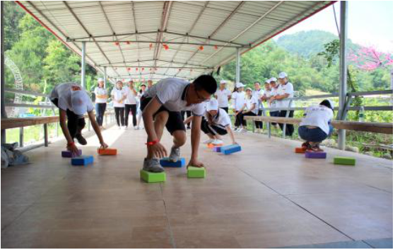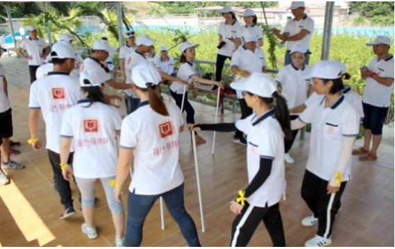 第三個(gè)游戲移行換位,主要培養(yǎng)了團(tuán)結(jié)一致、克服困難、協(xié)調(diào)能力增進(jìn)隊(duì)員間相互信任和理解的團(tuán)隊(duì)精神。