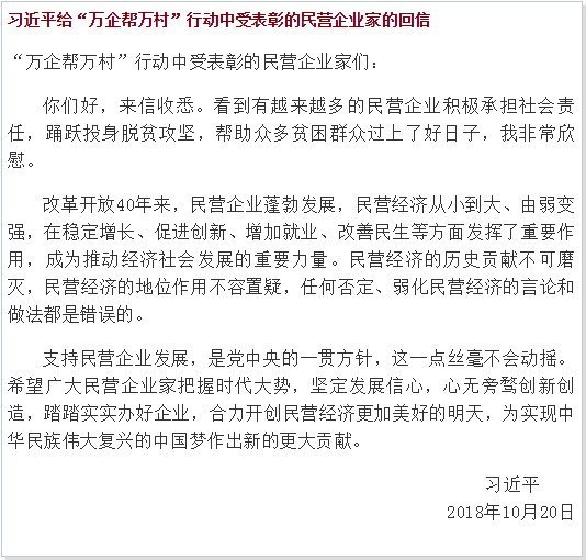 今年10月,全國工商聯(lián)、國務(wù)院扶貧辦等單位開展了“萬企幫萬村”行動先進(jìn)民營企業(yè)表彰活動,表彰了100家民營企業(yè)。近日,受到表彰的民營企業(yè)家給習(xí)近平總書記寫信,匯報了參與“萬企幫萬村”行動的體會,表達(dá)了繼續(xù)為脫貧攻堅貢獻(xiàn)力量的決心。10月20日,習(xí)總書記給“萬企幫萬村”行動中受表彰的民營企業(yè)家回信,對民營企業(yè)踴躍投身脫貧攻堅予以肯定,勉勵廣大民營企業(yè)家堅定發(fā)展信心,踏踏實實辦好企業(yè)。