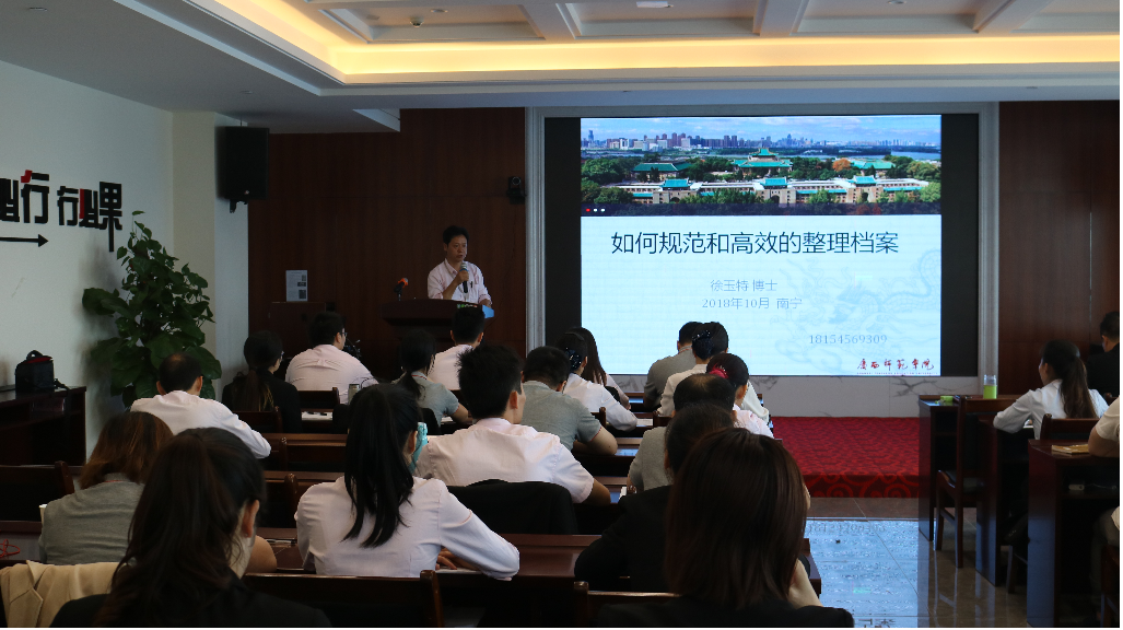 為提高公司各部門檔案管理水平,促進檔案管理工作進一步規(guī)范化,10月12日,投資公司特邀請廣西師范學院徐玉特博士擔任培訓講師,開展了高效、規(guī)范管理檔案培訓。投資公司、物業(yè)公司、酒店公司、南寧總裁辦和集團抽調人員共50人參加了本次檔案管理培訓。