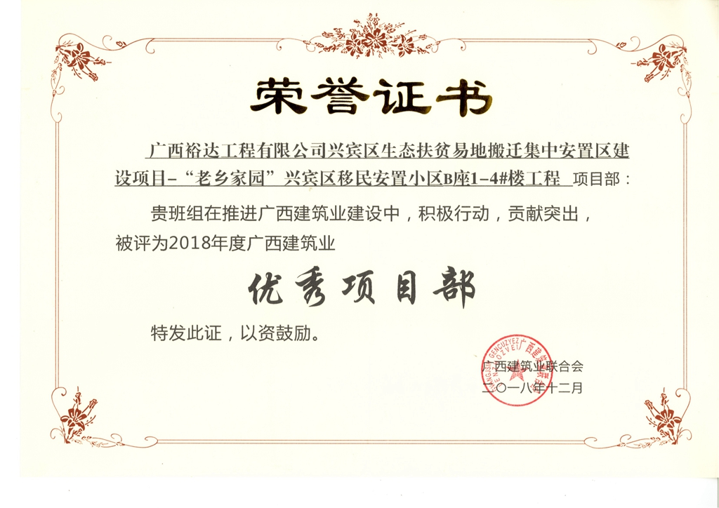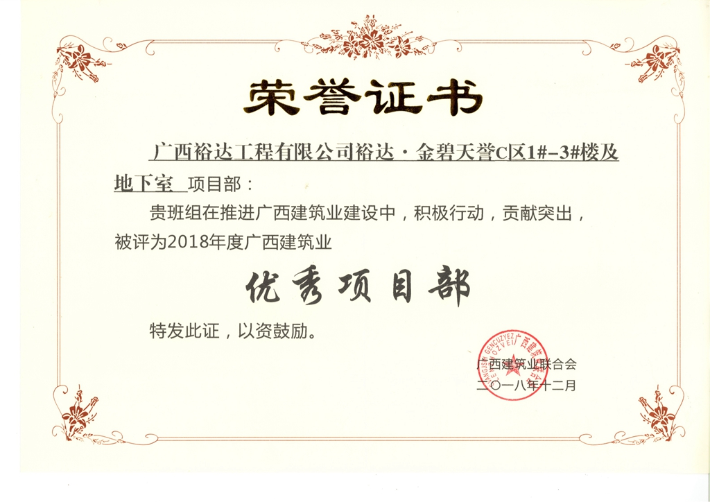 近日,從廣西建筑業(yè)聯(lián)合會獲悉,廣西裕達(dá)工程有限公司“老鄉(xiāng)家園”興賓區(qū)移民安置小區(qū)B座1-4#樓工程和裕達(dá)·金碧天譽(yù)C區(qū)1#-3#樓及地下室工程榮獲“2018年度廣西建筑業(yè)優(yōu)秀項(xiàng)目部”稱號,陳鑫、覃登年、陳慶策、周亞、覃小廣、朱文、肖文、陸麗玲、黃雄光、譚春艷、羅雪梅、莫馥甄、陳國錢、何壽恒、李奇茂、鄭曉娟、盧洋、蔣德榮、梁海云、龍永等20位員工獲得“2018年度廣西建筑業(yè)優(yōu)秀從業(yè)人員”稱號。