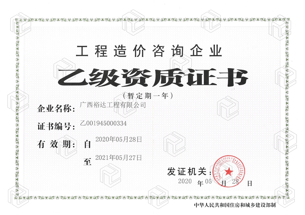 近日,經(jīng)自治區(qū)住房和城鄉(xiāng)建設(shè)廳的審核批準(zhǔn),公司喜獲“工程造價咨詢企業(yè)乙級資質(zhì)(暫定一年)”。