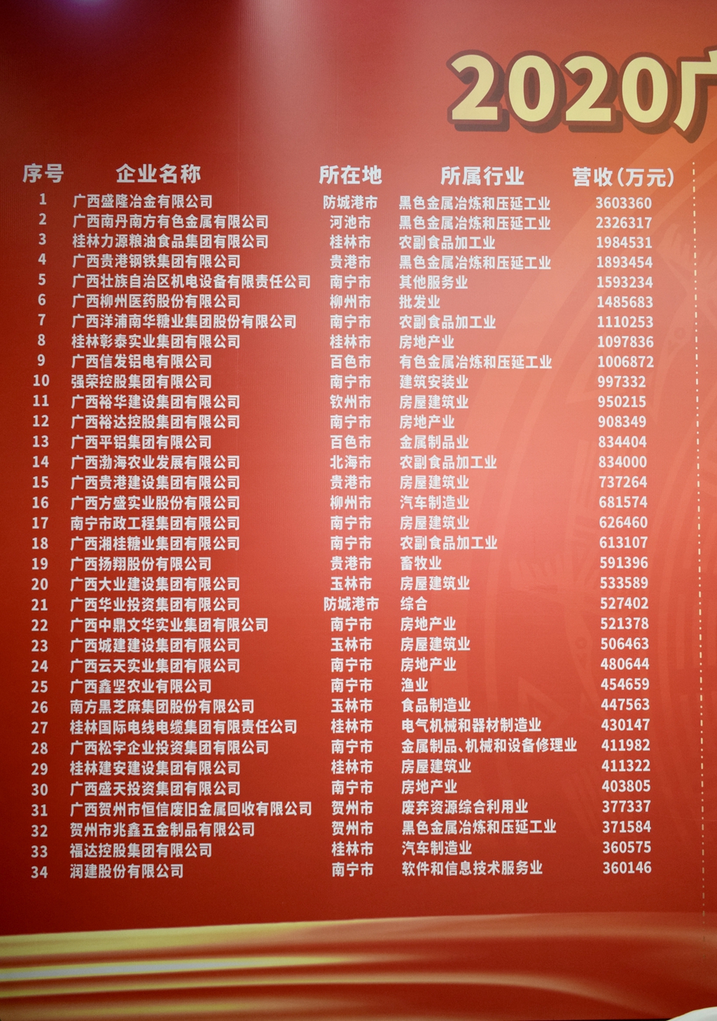 發(fā)布會首先公布了“2020廣西民營企業(yè)100強、制造業(yè)100強、最具競爭力民營企業(yè)、最具潛力民營企業(yè)、納稅10強企業(yè)”共5個榜單,并對入圍企業(yè)進行表彰,裕達控股集團以908349萬元營業(yè)收入榮獲2020年廣西民營企業(yè)第12強。