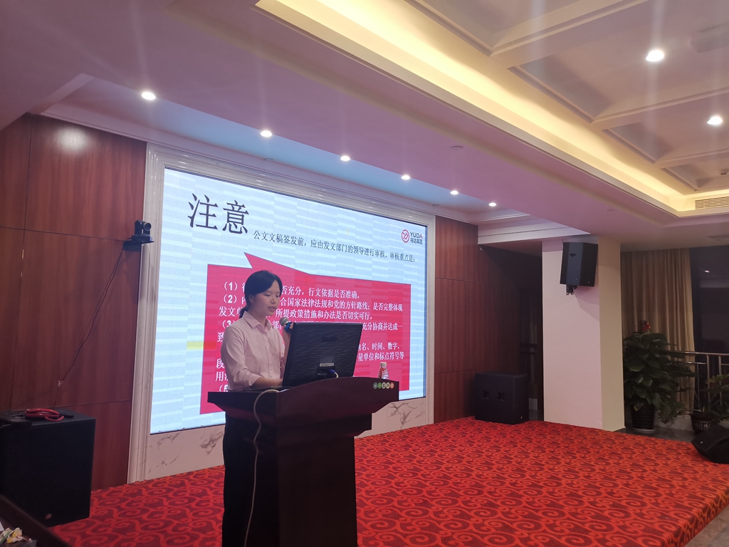 培訓(xùn)課上,林悅副主任講述了公文寫作的行政人員的基本技能、文件排版的基本要求,結(jié)合目前公司公文模板案例,分析、講解了公文處理的技巧和實(shí)際常用問題,并安排了現(xiàn)場(chǎng)練習(xí)與大家互動(dòng)。
