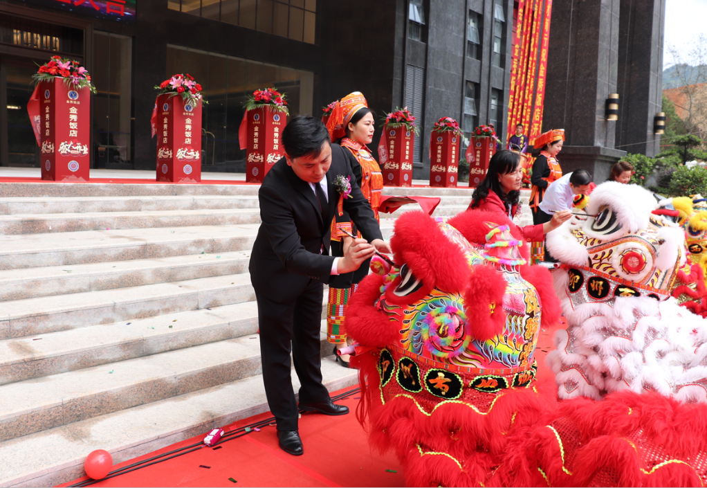 本次開業(yè)典禮規(guī)模盛大,現(xiàn)場(chǎng)鮮花錦簇,場(chǎng)面熱鬧非凡,儀式設(shè)有剪彩環(huán)節(jié)、睡獅點(diǎn)睛、接財(cái)鬧場(chǎng)等精彩紛呈的表演。參加慶典的金秀縣 “四家班子”領(lǐng)導(dǎo)代表與我集團(tuán)領(lǐng)導(dǎo)代表一行9人共同為金秀飯店的開業(yè)剪彩。金秀縣政協(xié)主席梁愛華、裕達(dá)控股集團(tuán)副總裁梁鋒、裕達(dá)控股集團(tuán)執(zhí)行副總裁兼來(lái)賓縣區(qū)域公司董事長(zhǎng)李夢(mèng)曉、裕達(dá)控股集團(tuán)總裁助理兼旅游集團(tuán)總裁何道軍4位領(lǐng)導(dǎo)共同為睡獅點(diǎn)睛,將本次開業(yè)典禮推向高潮。