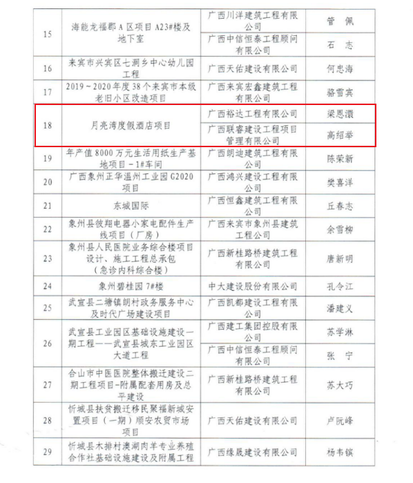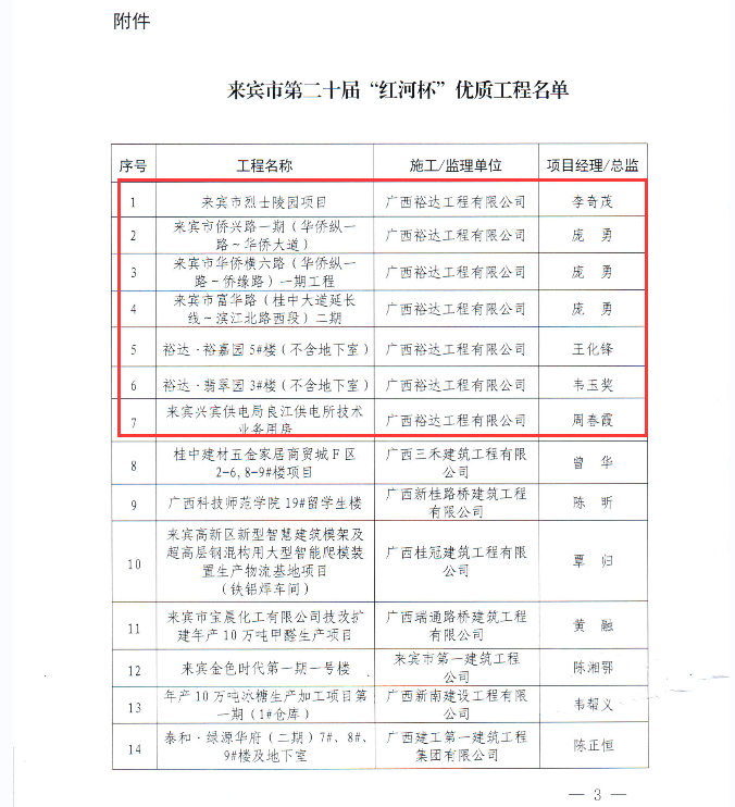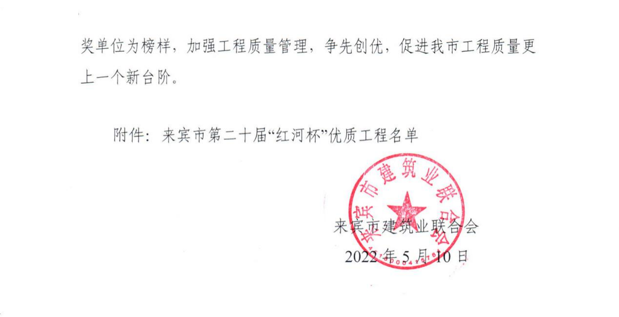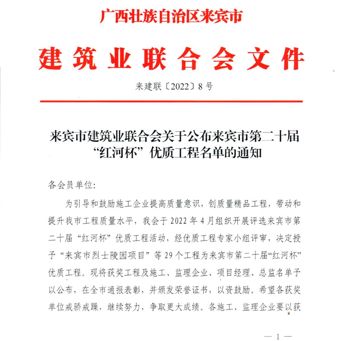 5月10日,來賓市建筑業(yè)聯(lián)合會印發(fā)《關(guān)于公布來賓市第二十屆“紅河杯”優(yōu)質(zhì)工程名單的通知》,廣西裕達(dá)工程有限公司承建的來賓市烈士陵園項(xiàng)目、裕達(dá)?裕嘉園5#樓(不含地下室)、裕達(dá)?翡翠園3#樓(不含地下室)等共8個(gè)項(xiàng)目榮獲來賓市第二十屆“紅河杯”優(yōu)質(zhì)工程獎(jiǎng)。