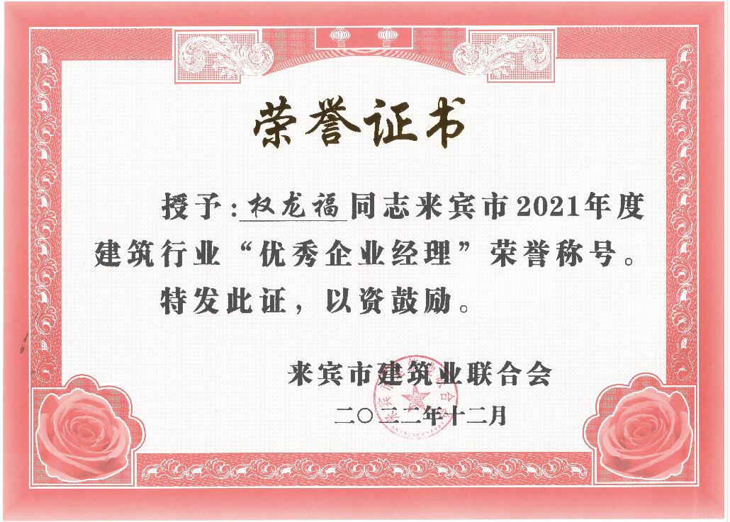 來(lái)賓市住房和城鄉(xiāng)建設(shè)局對(duì)來(lái)賓市建筑行業(yè)2021年度的先進(jìn)集體和優(yōu)秀個(gè)人進(jìn)行表彰,工程公司獲“來(lái)賓市建筑業(yè)先進(jìn)企業(yè)”榮譽(yù),公司總經(jīng)理權(quán)龍福還被評(píng)為“來(lái)賓市建筑業(yè)優(yōu)秀企業(yè)經(jīng)理”,公司徐海兵等8位員工被評(píng)為“來(lái)賓市建筑業(yè)優(yōu)秀建造師”;公司胡海深等8位員工被評(píng)為“來(lái)賓市建筑業(yè)優(yōu)秀安全員”。這些榮譽(yù)是公司全體員工一直以來(lái)辛勤耕耘和默默無(wú)聞奉獻(xiàn)的結(jié)果以及肯定,是工程公司綜合實(shí)力不斷提升和行業(yè)良好信譽(yù)的再次體現(xiàn),顯示工程公司得到社會(huì)和同行的認(rèn)可,必將“裕達(dá)品牌”的影響力和競(jìng)爭(zhēng)力提上新的臺(tái)階。