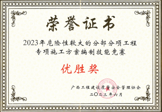 6月29日,工程公司在南寧參加由廣西工程建設(shè)質(zhì)量安全管理協(xié)會(huì)主辦的2023年全區(qū)建設(shè)工程危大工程專項(xiàng)施工方案編制技能晉級(jí)決賽,喜獲優(yōu)勝獎(jiǎng)。
