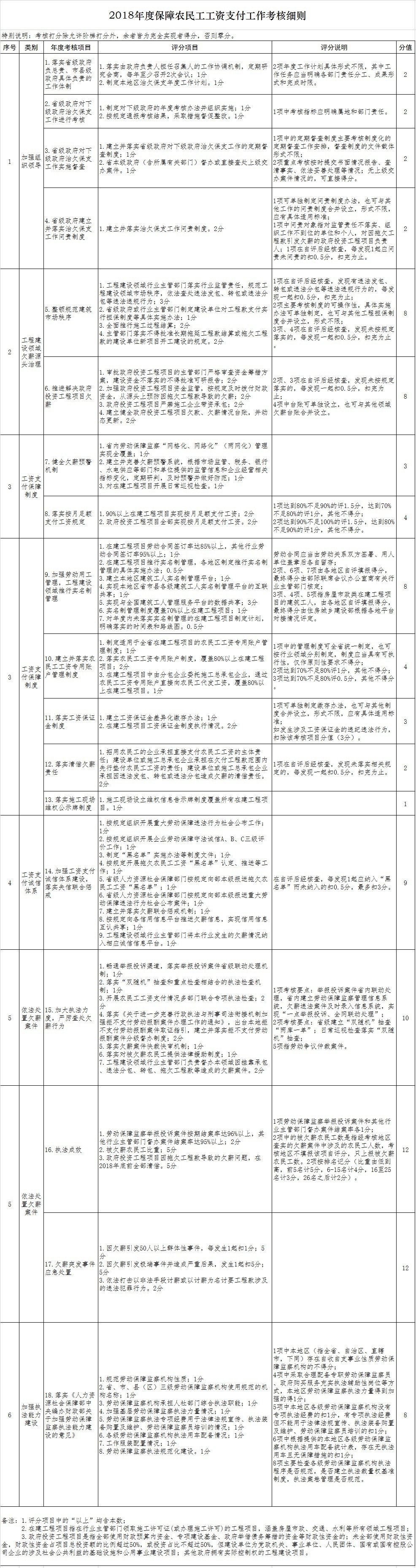 據(jù)部際聯(lián)席會議辦公室負(fù)責(zé)人介紹,今年的《考核細(xì)則》共有考核指標(biāo)65項,分為加強組織領(lǐng)導(dǎo)、工程建設(shè)領(lǐng)域欠薪源頭治理、工資支付保障制度、工資支付誠信體系、依法處置欠薪案件和加強執(zhí)法能力建設(shè)等5個方面?!犊己思?xì)則》將繼續(xù)堅持目標(biāo)導(dǎo)向、問題導(dǎo)向和結(jié)果導(dǎo)向,突出年度考核重點,注重考察治理欠薪實效。根據(jù)2017年度考核實施情況并結(jié)合各地區(qū)保障農(nóng)民工工資支付工作形勢,部際聯(lián)席會議在《考核細(xì)則》中,重點加強了對落實主管部門特別是工程建設(shè)行業(yè)主管部門責(zé)任、強化對欠薪失信企業(yè)信用懲戒以及推進落實工資支付保障制度的考核力度,加大相關(guān)項目的分值權(quán)重,充分發(fā)揮考核的正向?qū)蜃饔?,指?dǎo)和督促各地區(qū)嚴(yán)格落實屬地監(jiān)管責(zé)任,確保黨中央、國務(wù)院的關(guān)于保障農(nóng)民工工資支付的各項工作部署能夠真正落實落地。