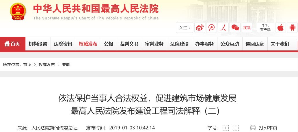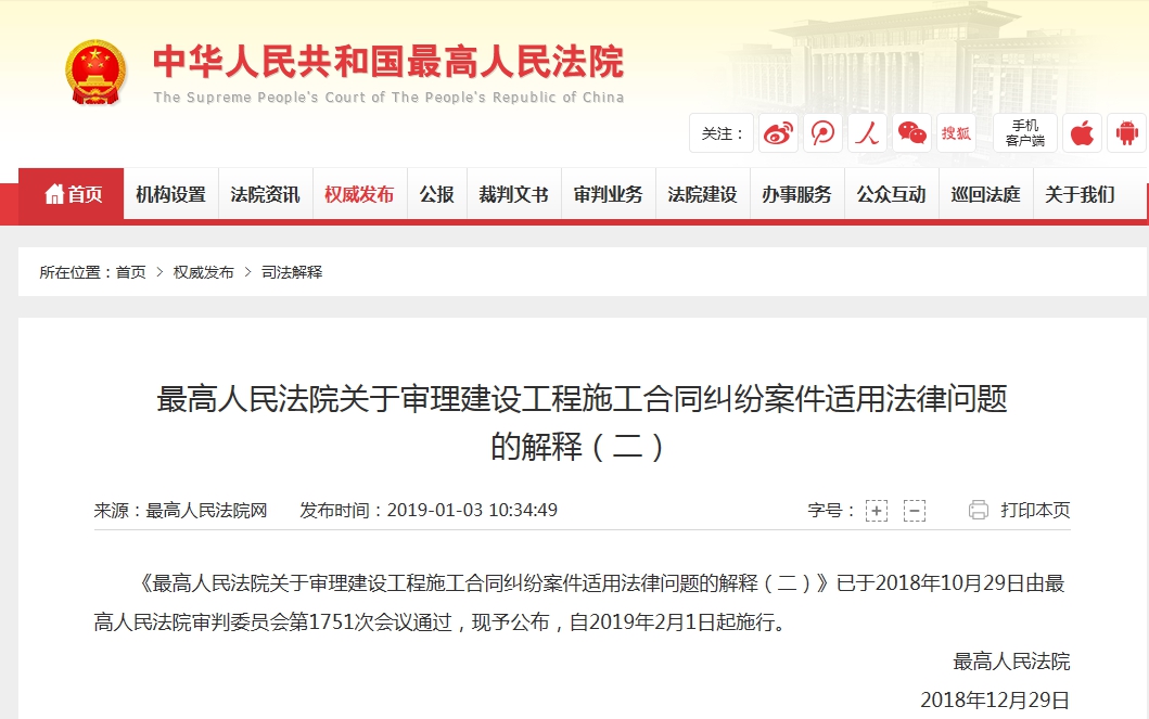 《關(guān)于審理建設(shè)工程施工合同糾紛案件適用法律問題的解釋(二)》(以下簡稱《解釋》),經(jīng)最高人民法院審判委員會第1751次會議討論通過,將于2019年2月1日起施行。