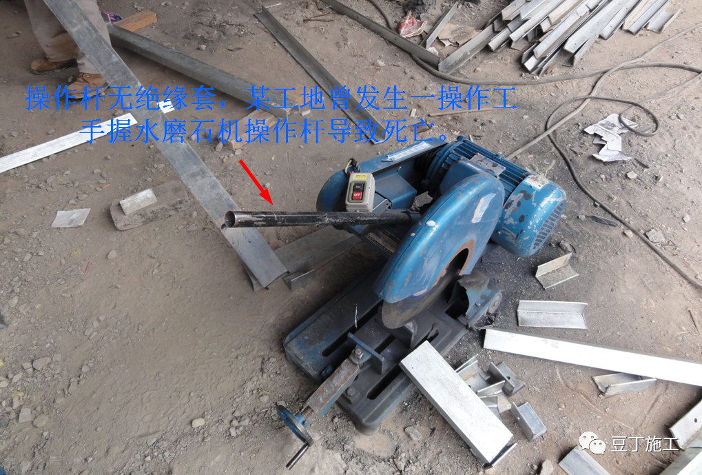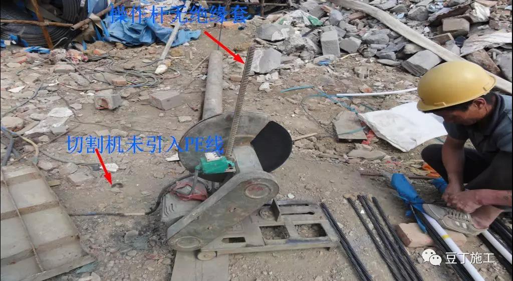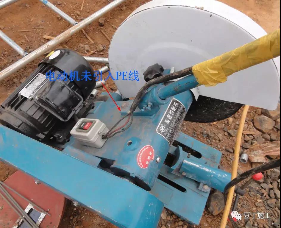 3、施工現(xiàn)場的施工機(jī)具,如電焊機(jī)、對焊機(jī)、碘鎢燈等外殼不接PE線;鋼筋彎曲機(jī)、鋼筋剪切機(jī)、切割機(jī)、臺鉆、打氣泵等電動機(jī)的接線盒內(nèi)的專用PE端子95%以上不接PE線,而且多數(shù)的操作把手無絕緣套。這是最普遍、最嚴(yán)重地違規(guī)。