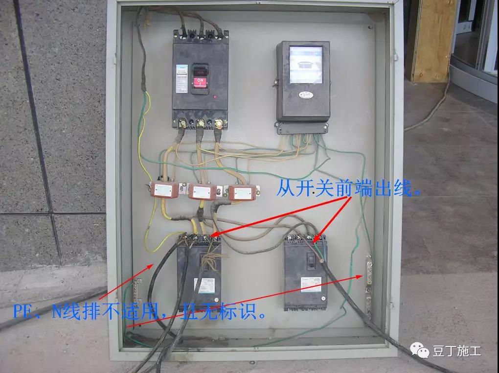 9、PE線、N線從開關(guān)箱內(nèi)引出不規(guī)范。不是按要求從PE、N端子板引出,而是象蜘蛛網(wǎng)一樣互相繞接后引出,亂拉亂接。違反強制性條文8.1.11條規(guī)定。