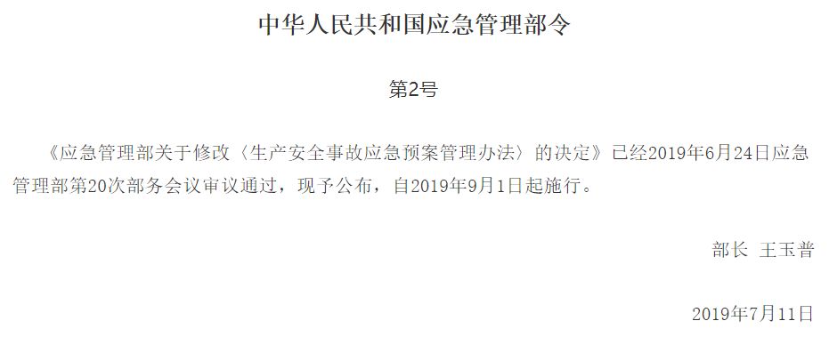 7月11日,應急管理部發(fā)布“中華人民共和國應急管理部令第2號”:《應急管理部關(guān)于修改〈生產(chǎn)安全事故應急預案管理辦法〉的決定》(下面簡稱《決定》)已經(jīng)2019年6月24日應急管理部第20次部務(wù)會議審議通過,自2019年9月1日起施行