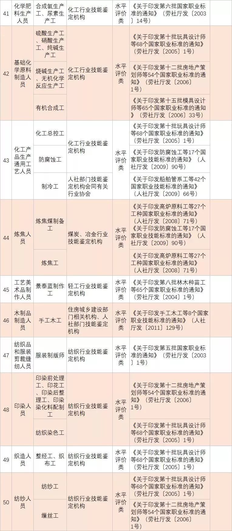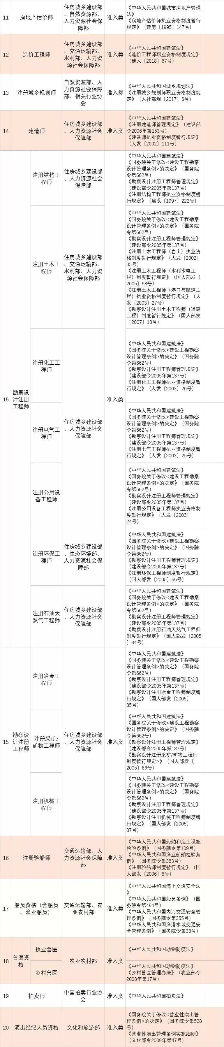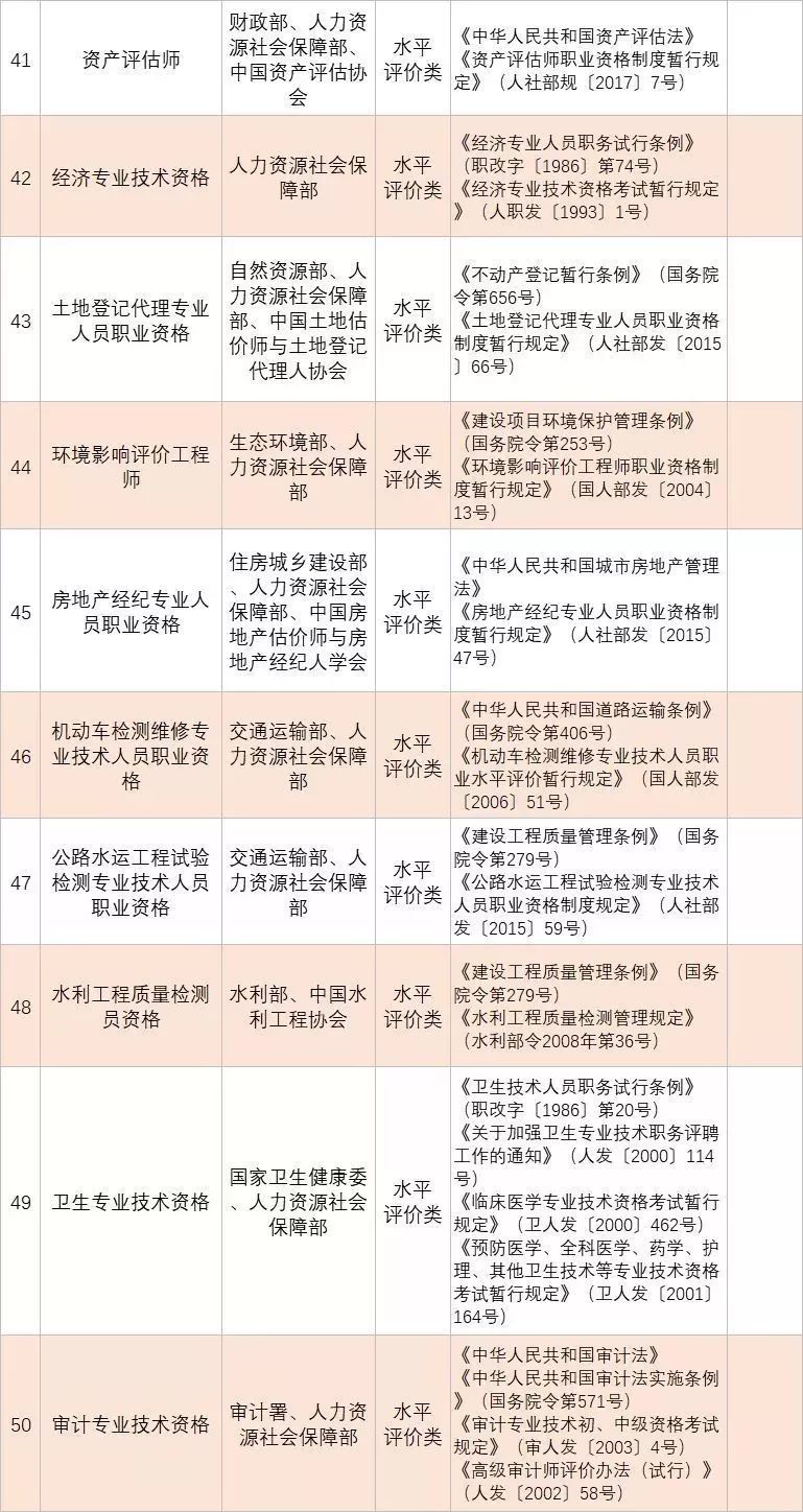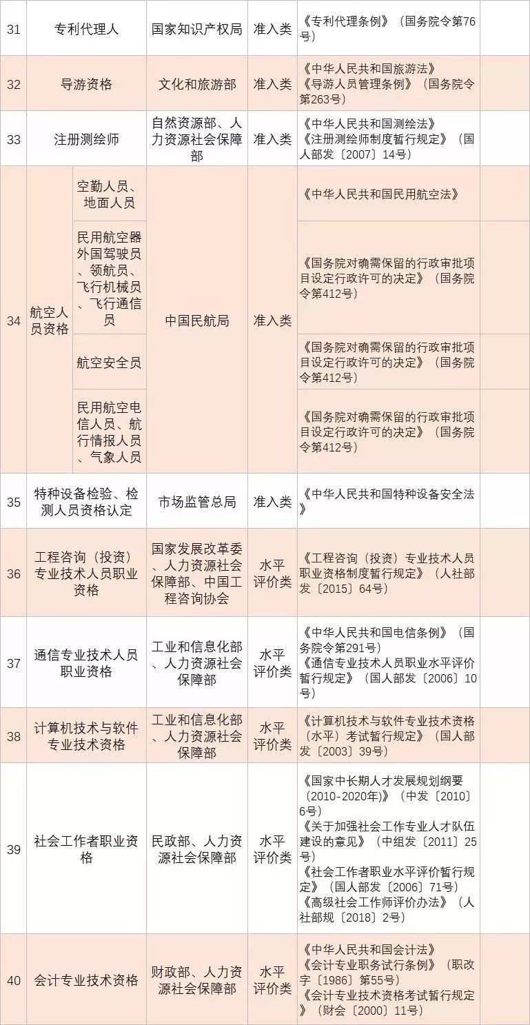 (四)深化技能人員職業(yè)資格制度改革。鞏固職業(yè)資格改革成果,完善國家職業(yè)資格目錄。對準(zhǔn)入類職業(yè)資格,繼續(xù)保留在國家職業(yè)資格目錄內(nèi)。對關(guān)系公共利益或涉及國家安全、公共安全、人身健康、生命財(cái)產(chǎn)安全的水平評價(jià)類職業(yè)資格,要依法依規(guī)轉(zhuǎn)為準(zhǔn)入類職業(yè)資格。對與國家安全、公共安全、人身健康、生命財(cái)產(chǎn)安全關(guān)系不密切的水平評價(jià)類職業(yè)資格,要逐步調(diào)整退出目錄,對其中社會通用性強(qiáng)、專業(yè)性強(qiáng)、技術(shù)技能要求高的職業(yè)(工種),可根據(jù)經(jīng)濟(jì)社會發(fā)展需要,實(shí)行職業(yè)技能等級認(rèn)定。