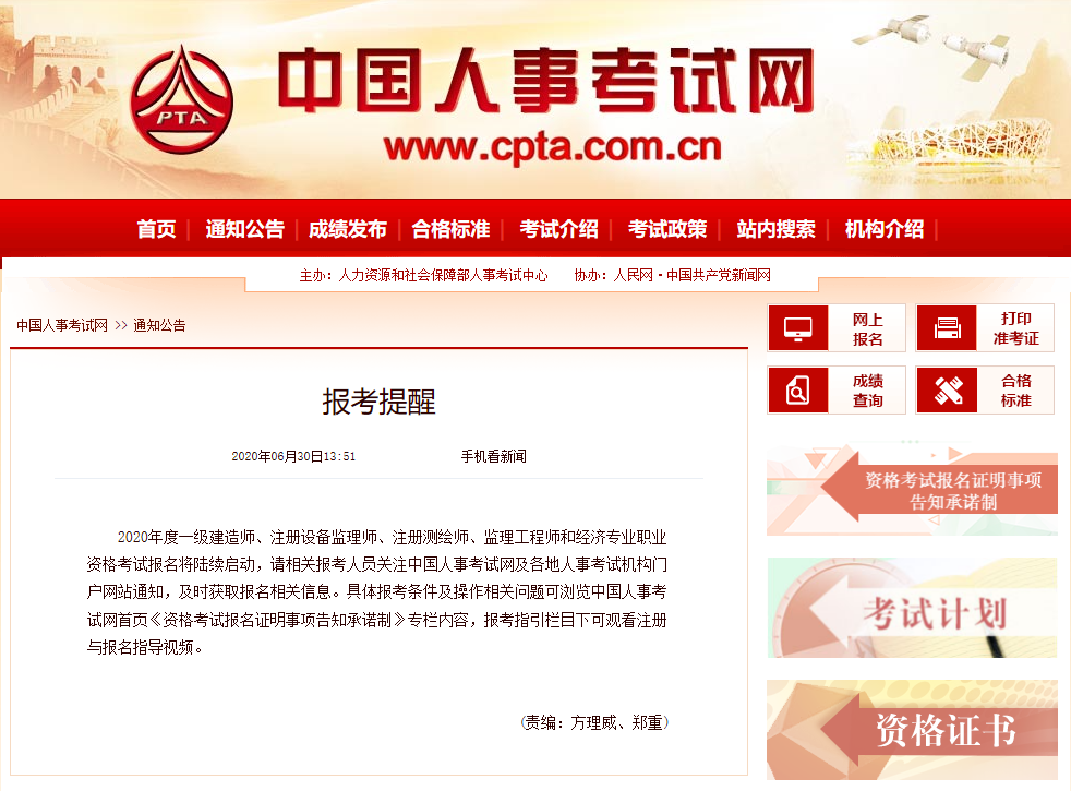 2020年度一級(jí)建造師、注冊(cè)設(shè)備監(jiān)理師、注冊(cè)測(cè)繪師、監(jiān)理工程師和經(jīng)濟(jì)專業(yè)職業(yè)資格考試報(bào)名將陸續(xù)啟動(dòng),請(qǐng)相關(guān)報(bào)考人員關(guān)注中國(guó)人事考試網(wǎng)及各地人事考試機(jī)構(gòu)門戶網(wǎng)站通知,及時(shí)獲取報(bào)名相關(guān)信息。
