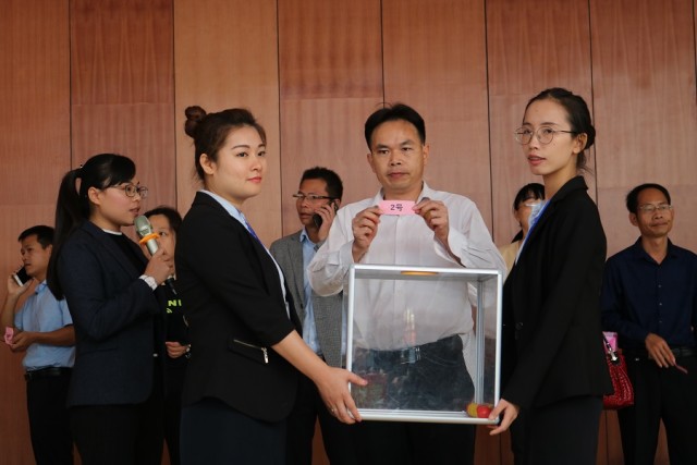 在工人員宣讀抽簽分房流程后,開(kāi)始抽簽分房。首先由各鄉(xiāng)鎮(zhèn)領(lǐng)導(dǎo)代表以鄉(xiāng)鎮(zhèn)為單位抽簽確定貧困戶選房順序,再由貧困戶逐戶進(jìn)行抽簽選房并確認(rèn)。當(dāng)天,經(jīng)過(guò)核驗(yàn)材料、抽房號(hào)、登記信息、簽訂合同等一系列程序后,參加此次來(lái)賓市興賓區(qū)易地扶貧搬遷“老鄉(xiāng)家園”安置點(diǎn)分房?jī)x式的455戶貧困戶,除36戶因材料核驗(yàn)未通過(guò)外,419戶都抽到了新房。除抽簽分房外,當(dāng)天,就業(yè)服務(wù)中心還與每戶貧困戶簽訂了就業(yè)培訓(xùn)協(xié)議,興賓區(qū)工管委領(lǐng)導(dǎo)與貧困戶簽訂幫扶協(xié)議。