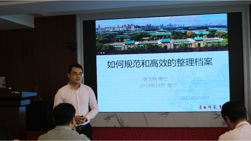 為提高公司各部門檔案管理水平,促進檔案管理工作進一步規(guī)范化,10月12日,投資公司特邀請廣西師范學院徐玉特博士擔任培訓講師,開展了高效、規(guī)范管理檔案培訓。投資公司、物業(yè)公司、酒店公司、南寧總裁辦和集團抽調人員共50人參加了本次檔案管理培訓。