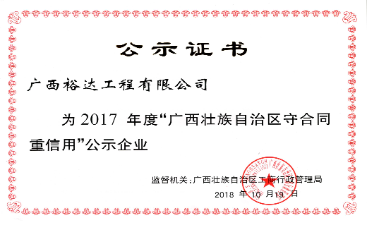 2017年度廣西“守合同重信用”企業(yè),是自治區(qū)工商局對申報企業(yè)的品牌經(jīng)營管理、合同信用管理、合同履行狀況以及企業(yè)經(jīng)營效益等方面內(nèi)容,經(jīng)過嚴格的評價后,對達到規(guī)定標準的企業(yè)向社會予以公示和表彰的一種榮譽。