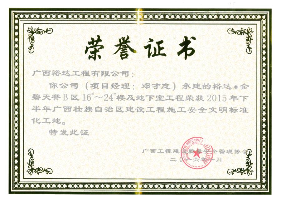 裕達(dá)·金碧天譽(yù)B區(qū)16#-24#樓及地下室工程榮獲2015年下半年“廣西壯族自治區(qū)建設(shè)工程安全文明標(biāo)準(zhǔn)化工地”