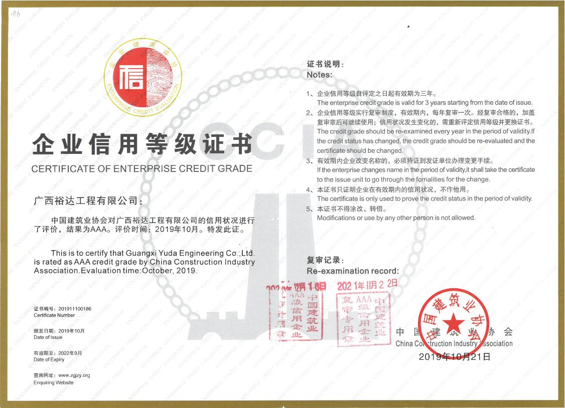 建筑企業(yè)信用等級證書,由中國建筑業(yè)協(xié)會通過各項指標對企業(yè)進行綜合評估出示的信用等級報告,企業(yè)信用等級分為AAA(信用很好)、AA、A、B、C三等五級,實行動態(tài)管理,獲證后前2年每年進行復審,每3年進行一次復評。既是企業(yè)的一種榮譽,也在許多商業(yè)活動中能夠廣泛應用。