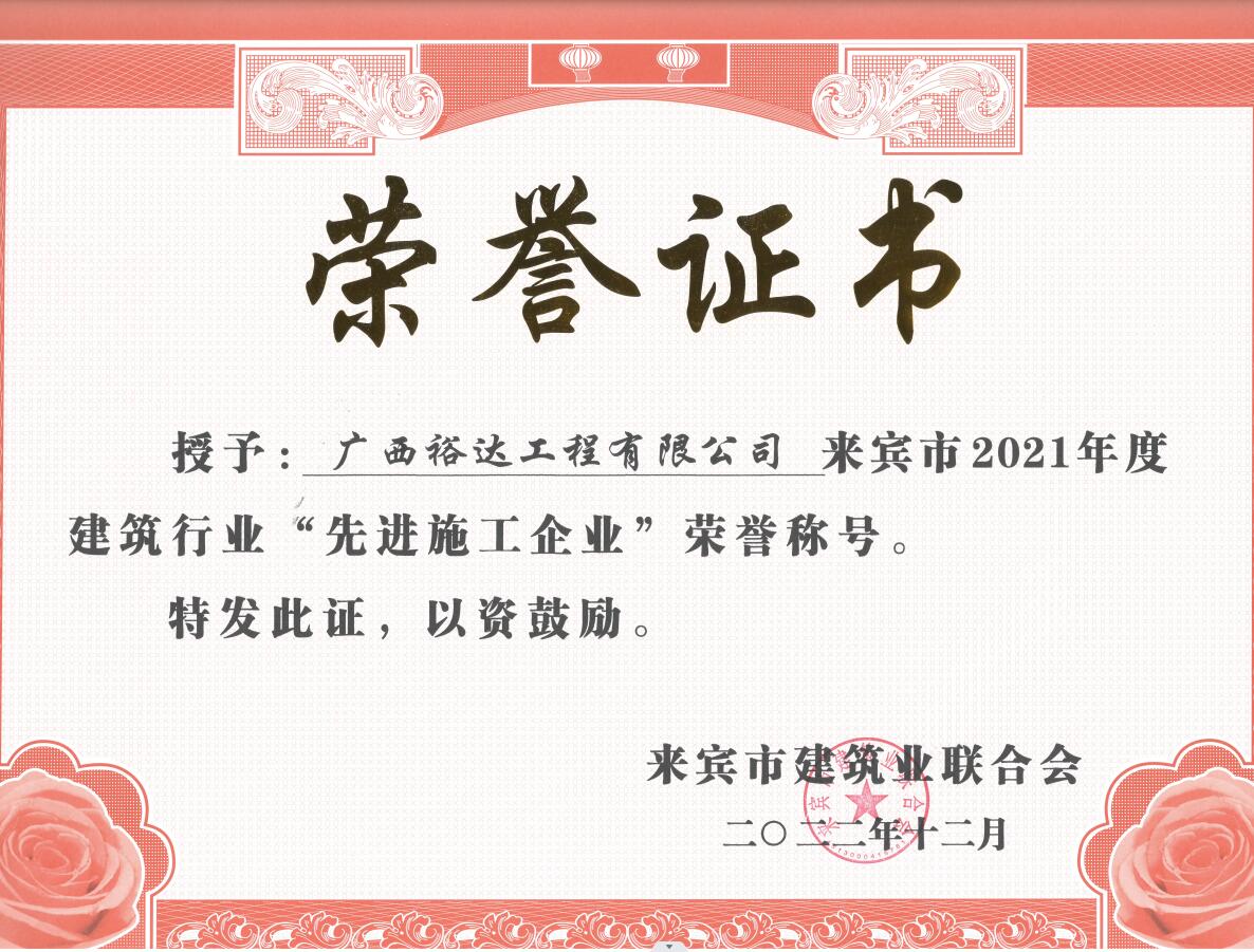 來(lái)賓市住房和城鄉(xiāng)建設(shè)局對(duì)來(lái)賓市建筑行業(yè)2021年度的先進(jìn)集體和優(yōu)秀個(gè)人進(jìn)行表彰,工程公司獲“來(lái)賓市建筑業(yè)先進(jìn)企業(yè)”榮譽(yù),公司總經(jīng)理權(quán)龍福還被評(píng)為“來(lái)賓市建筑業(yè)優(yōu)秀企業(yè)經(jīng)理”,公司徐海兵等8位員工被評(píng)為“來(lái)賓市建筑業(yè)優(yōu)秀建造師”;公司胡海深等8位員工被評(píng)為“來(lái)賓市建筑業(yè)優(yōu)秀安全員”。這些榮譽(yù)是公司全體員工一直以來(lái)辛勤耕耘和默默無(wú)聞奉獻(xiàn)的結(jié)果以及肯定,是工程公司綜合實(shí)力不斷提升和行業(yè)良好信譽(yù)的再次體現(xiàn),顯示工程公司得到社會(huì)和同行的認(rèn)可,必將“裕達(dá)品牌”的影響力和競(jìng)爭(zhēng)力提上新的臺(tái)階。