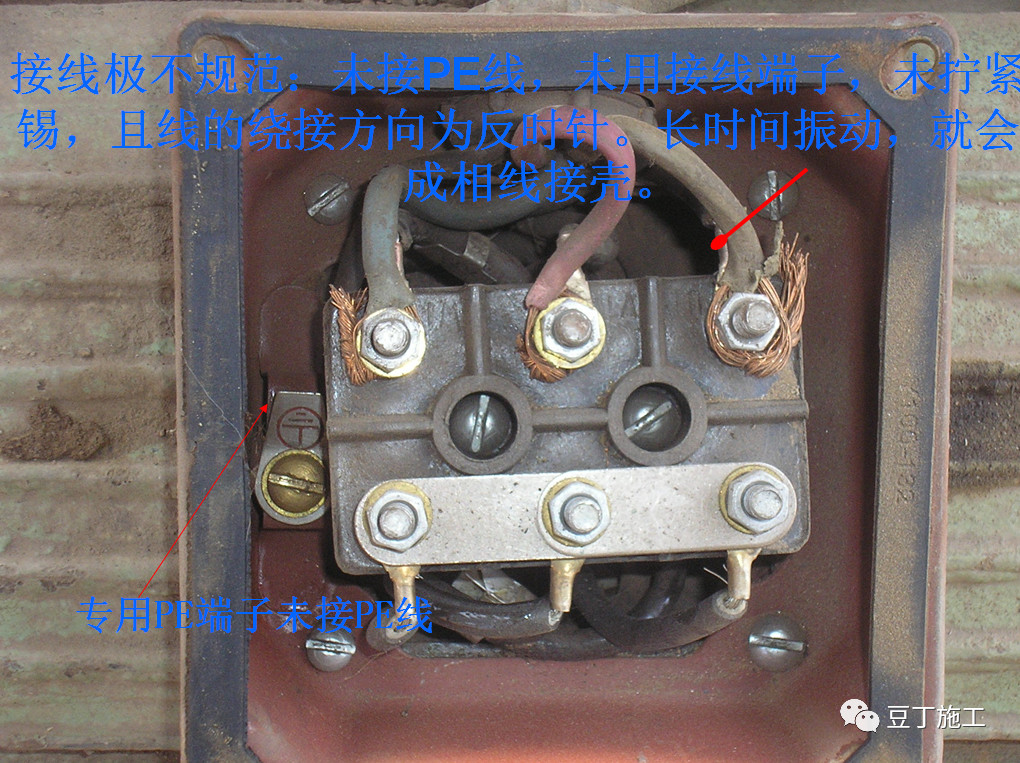 3、施工現(xiàn)場的施工機(jī)具,如電焊機(jī)、對焊機(jī)、碘鎢燈等外殼不接PE線;鋼筋彎曲機(jī)、鋼筋剪切機(jī)、切割機(jī)、臺鉆、打氣泵等電動機(jī)的接線盒內(nèi)的專用PE端子95%以上不接PE線,而且多數(shù)的操作把手無絕緣套。這是最普遍、最嚴(yán)重地違規(guī)。