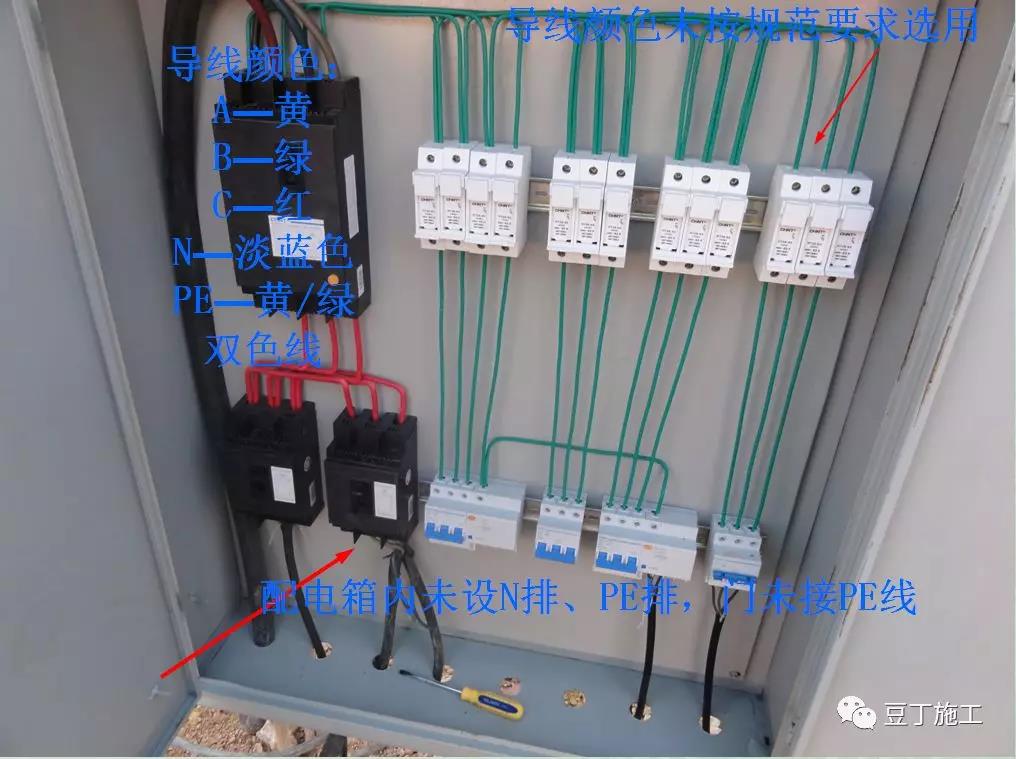9、PE線、N線從開關(guān)箱內(nèi)引出不規(guī)范。不是按要求從PE、N端子板引出,而是象蜘蛛網(wǎng)一樣互相繞接后引出,亂拉亂接。違反強制性條文8.1.11條規(guī)定。